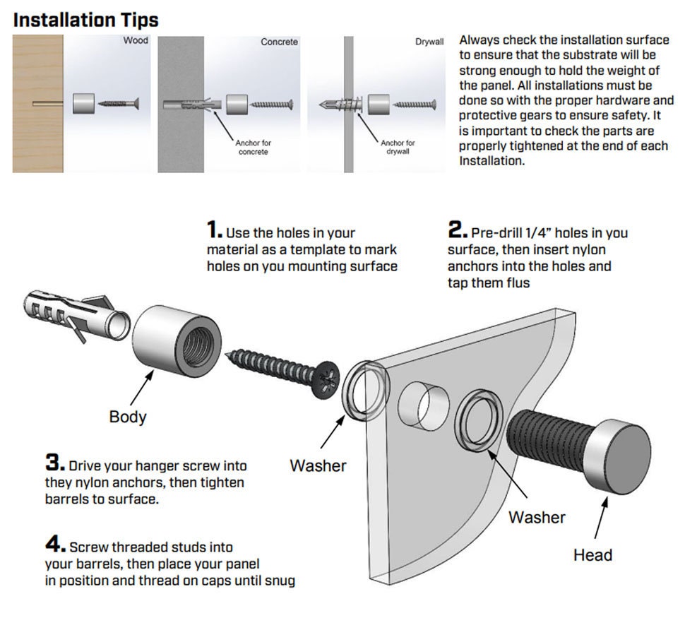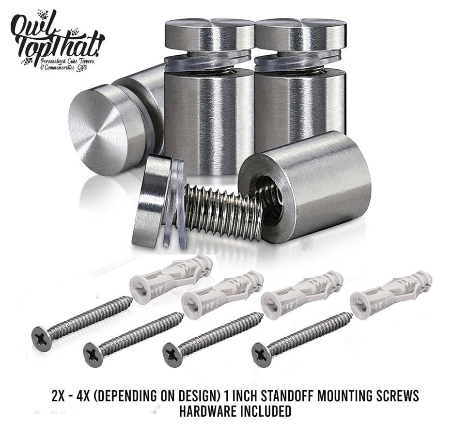 ⦁ Our Off The Wall Acrylic Signages will come equipped with a 2x to 4x (depending on design) 1 inch Brushed Metal Standoff Mounting screws.